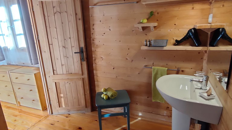 Para los amantes de la naturaleza que deseen disfrutar de estancia más rústica, situada aparte de la casa principal, alojarse en nuestro bungalow de madera puede ser una opción excelente. Esta casita de madera, de veinte metros cuadrados, es perfecta para dos personas. Dispone de una cama doble y de un baño con ducha, artículos de higiene personal, secador de pelo y toallas. También posee televisor de pantalla plana, aire acondicionado, wifi gratuito y minibar (de pago). Todas con cama doble, no divisible.